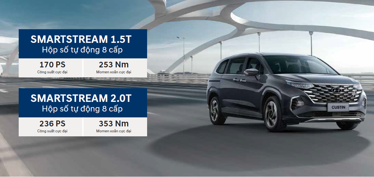 Hyundai Custin vận hành mạnh mẽ và êm ái với 2 tùy chọn động cơ turbo smartstream thế hệ mới: 1.5 T-GDI và 2.0 T-GDI